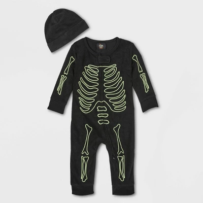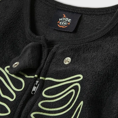 Give your darling a glowing look this Halloween with the Glow-In-The-Dark Skeleton Halloween Matching Family Footed Pajamas from Hyde & EEK! Boutique™. These black pajamas feature an illustration of a skeleton that glows in the dark for a spooky appeal. Made with soft fabric in a fitted fit, these glow-in-the-dark matching family pajamas offer comfort and help keep their head covered with the included black hat. The front half-length zipper closure allows easy dressing and changing, and the snap tab helps protect their chin from scratches. Have your whole family wear the union suits from the Glow-In-The-Dark Skeleton Halloween Matching Family Union Suit Collection to create a coordinated look for Halloween photo-ops.