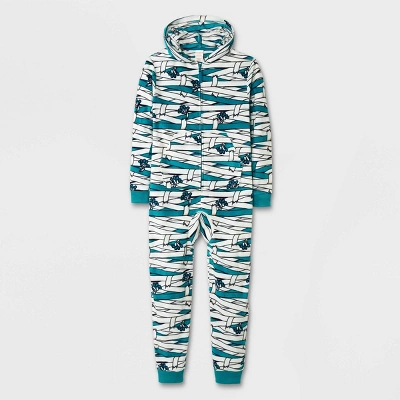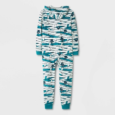 Your kid will love being a mummy this Halloween by wearing the Halloween Mummy Union Suit from Cat & Jack™. This white union suit features white and teal green hues, as well as teal blue cuffs for an eye-catching contrast and a snug fit. Made with soft fabric and sporting a kangaroo pocket, this hooded union suit helps keep them both comfy and cozy. Plus, it comes with front half-length zipper closure for easy dressing.