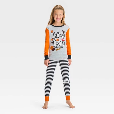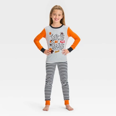 This quirky 2-Piece Hershey’s “No Tricks Just Treats” Halloween Long-Sleeve Pajama Set is sure to become your kid’s favorite sleepwear pick for the spooky season. This PJ set includes a long-sleeve tee and pajama pants, both crafted from 100% cotton with ribbed cuffs and ankles for all-night snug comfort. Designed with orange sleeves and black cuffs, the tee features the message “No Tricks Just Treats” with different illustrations of Hershey’s treats. It’s accompanied by black and white striped pajama pants for a coordinated look.