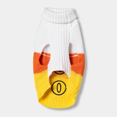 Help your furry BFF score all the treats this Halloween by dressing them in this Halloween Candy Corn Boo Dog and Cat Sweater from Hyde & EEK! Boutique™! Made from midweight knit to chase away autumn’s chill, this cute pull-on, full-body pet sweater features front leg openings for easy movement. Covered in candy-corn inspired white, orange and yellow stripes, this pet sweater shouts “Boo” spelled out in spooky black patches on the back. Fun and practical for the change of season, your pet will look picture perfect in this precious sweater!